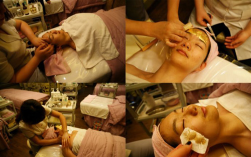 第一步:往脸上贴金。洁面加简单的精油按摩之后,小心翼翼地敷上纯金箔给皮肤排毒。